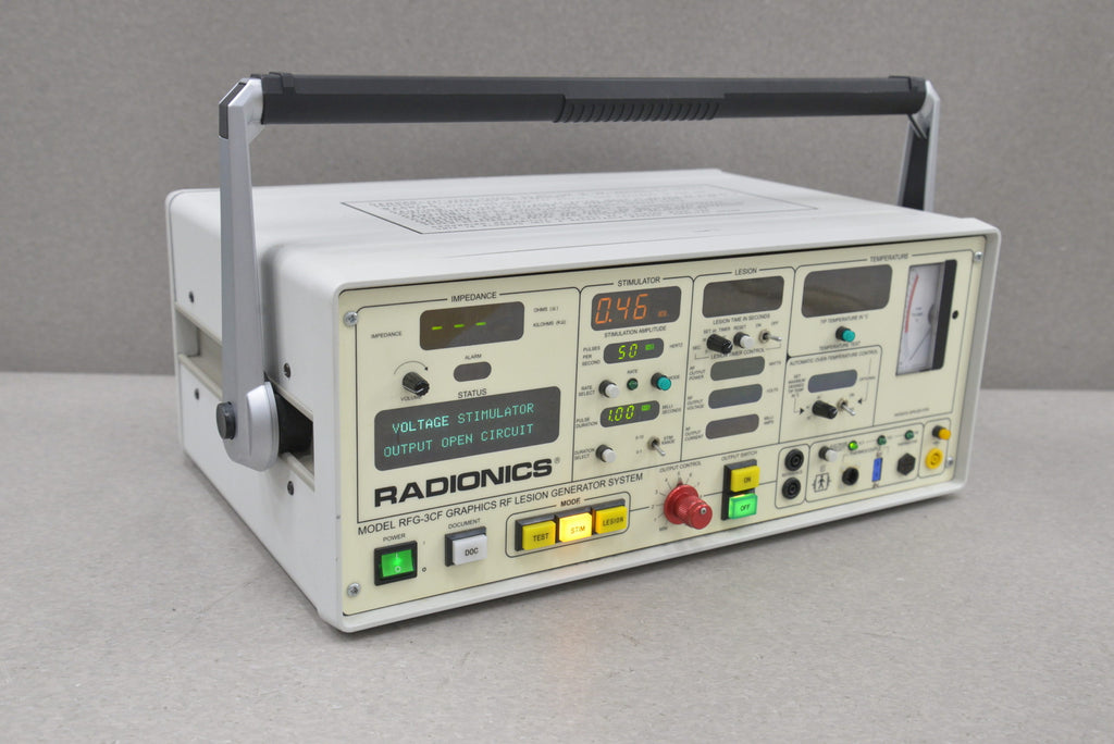 Le Radionics RFG-3CF est un générateur de lésions par radiofréquence utilisé principalement dans le domaine médical, notamment en neurochirurgie, orthopédie et podologie. Cet appareil est conçu pour créer des lésions ciblées dans les tissus nerveux grâce à la chaleur générée par des courants de radiofréquence au niveau de l'extrémité d'une électrode sélectionnée.