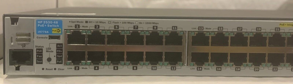 Switch HP 2530-48 J9778A PoE+ Integrated 10/100 Base-TX Ports (1-48)Testé Et Fonctionnel Fourni Avec Son Adaptateur Secteur Manque Le Petit Cache Sur La Façade ( Voir Photo)