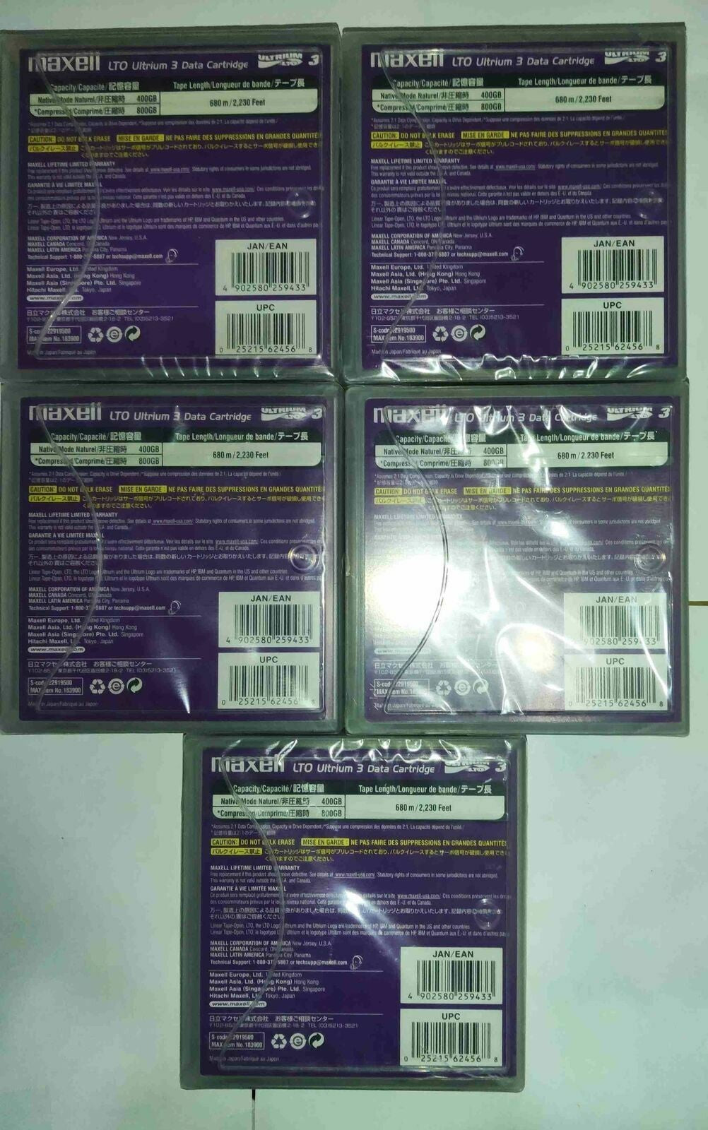 LOT DE 5 Maxell 22919500 Cartouche de bande LTO Ultrium 3 400 GB / 800 GB Support amovible